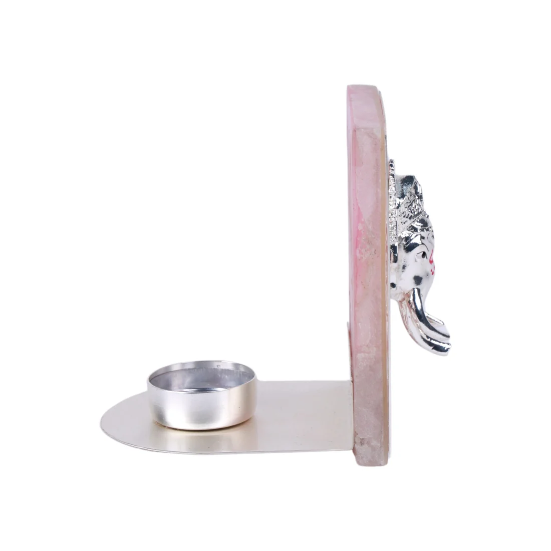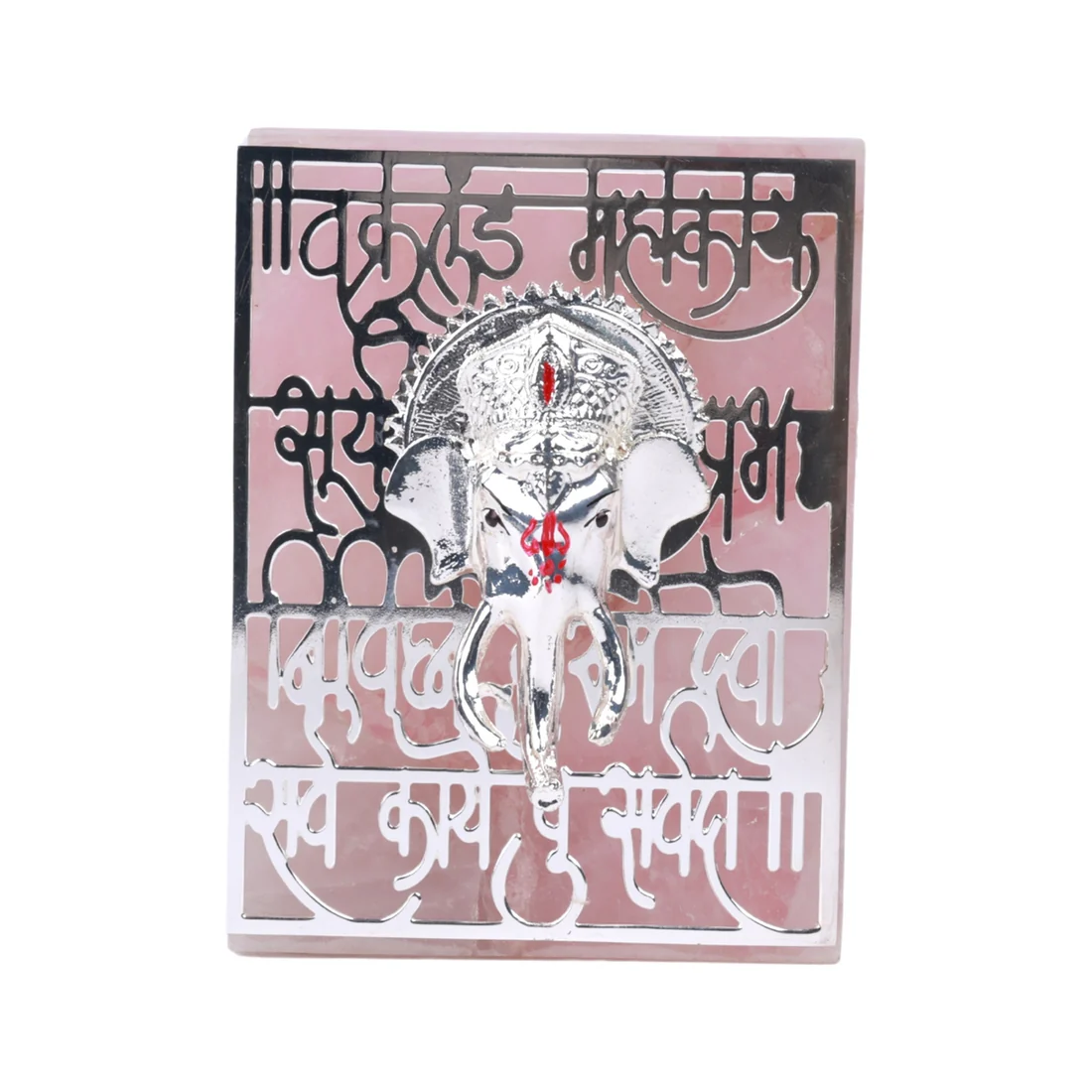 The realm of divine radiating devotion and grace, the resplendent Lord Ganesha made from special metal is a mesmerizing masterpiece. Crafted with utmost precision, this exquisite idol, adorned with intricate embellishments is mounted on a silver frame proudly with auspicious shloka, radiating divine blessings Material – Silver with Precious Pink Stone