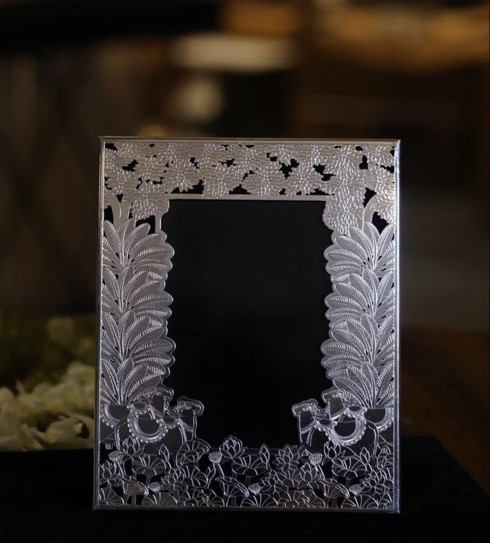Exquisitely handcrafted designer photo frame emanates an irresistible charm. Each meticulously placed embellishments tells a story, creating a mesmerising mosaic of beauty and elegance.Display your cherished memories with time