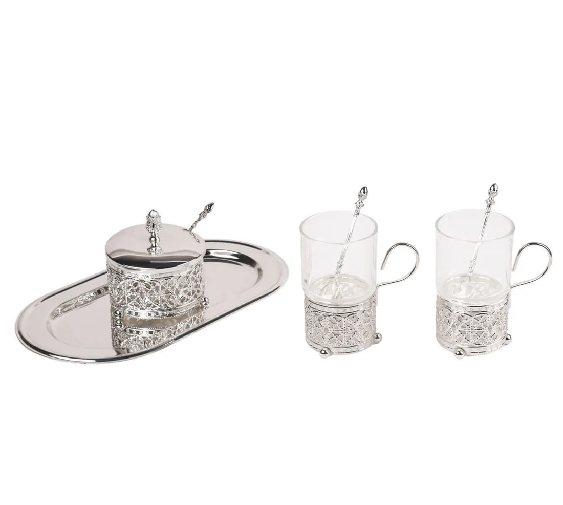 The Sugar Pot with Tray & 2 Glasses is a beautifully crafted silver-plated set designed to elevate your tea-time experience. This luxurious set includes a finely detailed sugar pot, an elegant matching tray, and two sophisticated glasses, making it perfect for serving guests during special occasions. Its intricate craftsmanship and premium finish make it a statement piece for any dining collection. Ideal for festive gatherings, high-tea setups, and premium gifting, this set is both practical and aesthetically pleasing.
